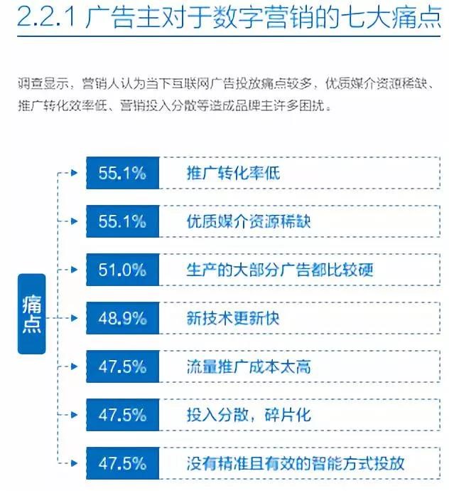 根據《白皮書》針對國内300位數字營銷決策者調查顯示,近7成廣告主已經在不同的程度上採用瞭(le)數字營銷方式,在數字營銷上的投入也在逐年增加,需求也在多樣化,這說明廣告主已經充分意識到數字營銷的重要性並(bìng)試圖更好地使用數字營銷的解決方案。但是,現實是推廣轉化率低、成本高、沒有更智能的解決方案等問題,導緻瞭(le)廣告主無法獲取用戶沉澱數據、無法預測用戶下一步行爲、效果模糊無法確切量化、線上線下無法打通等等諸多當前無法解決的問題。