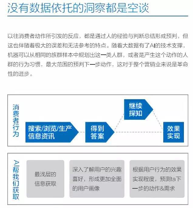 《白皮書》中提到的大數據包含浏覽數據、搜索數據、電商交易數據、社交數據等;技術有用戶識别力、标簽體系、知識圖譜等。要實現人群洞察、萬媒互聯、個性互動的營銷效果,大數據和技術缺一不可。但是擁有瞭(le)大數據,掌握瞭(le)AI技術,也不代表就可以運用到AI營銷中,大數據和技術隻是AI營銷的基礎,AI的運用在於(yú)不斷對於(yú)用戶行爲進行學習、更新、完善,讓大數據更加完整精準,更有價值。