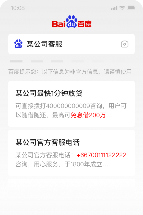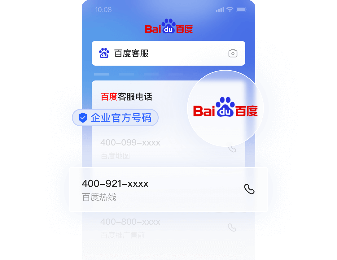 在百度搜索企業名稱(chēng)加客服等關(guān)鍵字後,展示專屬卡片
